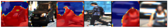 We can see that the image feature weight of small objects was evidently higher than that of cars. We then visualized the results. We made a figure to depict the feature weight distribution (Figure 8). The red color represents the area where the point cloud has a higher weight than the image, and the blue color represents the area where the image weight is higher than that of the point cloud. We can see the two kinds of feature weight distributions. The important image feature area is represented by the blue color, which correlates with the position and contour of the objects in the image block. For small objects, due to their small area in the image, the area and weight of the image features will be relatively large. We analyzed the reason behind this phenomenon. Specifically, since the objects must be detected and located by the point cloud feature, the main part of the objects always has a higher point cloud weight. Given that the image can help us better locate the object’s position in the image and distinguish the foreground and background area, the image feature occupies the background area, near the outline of the objects. And, as discussed in Section 1 of this article, the gain effect of the image segmentation method on 3D object detection can be discussed. The area and contour information of the object obtained from images play an auxiliary role in 3D object detection, although we did not make a segmentation for the image, the image feature tends to outline the object, and we can understand that the image segmentation method can have an evident function in stereo 3D object detection, as confirmed by other works [1,2].