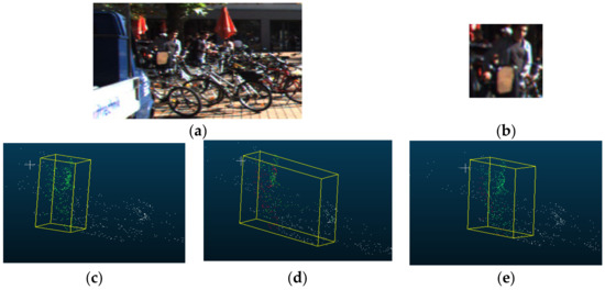 This conclusion can be understood through the problem shown in Figure 10. As shown in Figure 10, since the pedestrians in Figure 10a partially overlap with many bicycles, the foreground and background segmentation effectiveness becomes worse. In the process of foreground and background segmentation of objects using only feature fusion methods, the lack of category information leads to deficiencies in the foreground and background segmentation stage. The ground-true segmentation result is shown in Figure 10c, and the segmentation result after feature fusion is shown in Figure 10d where white represents the background point cloud, green represents the foreground point cloud, and red represents the misjudged point cloud. We can see that this method makes the segmentation results in this situation very inaccurate, so that the regression effect of the 3D box was also obviously different from the real one. Using the category reweighting method proposed in this article, inspired by the important role of image features (structure shown in Figure 7), we can achieve better results, as shown in Figure 10e. At the same time, we used PSMNet [12] and GANet [34] as models to finish the disparity estimation and generate point cloud data. We compared the segmentation and detection accuracy of different methods, and the way in which category vectors were directly concatenated with fused features. We used the small object as the research object, as shown in Table 7, Table 8, Table 9 and Table 10.