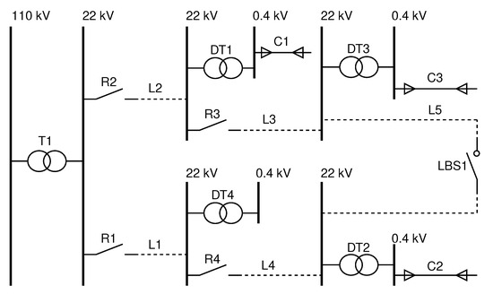 Unintended power outages are invariably unwelcome due to the associated costs arising from the duration of the disruption. Components of CI are significantly dependent on electrical power. In the event of power disruptions to these CI components, the consequent financial consequences can be significant. Moreover, extended or large-scale outages can bring in not just financial detriments but also social, cyber, and other multifaceted issues. The optimization effort of this paper primarily aims to minimize these associated losses and curtail the threat risk associated with the malfunction of CI’s crucial components, as detailed in [28]. To delve deeper into the risk concerning the power failure of such pivotal components and consequently enhance the overall system’s reliability, the paper clarifies these issues using the test network spotlighted in Section 3.1. To commence, it is imperative to define the precise operational dynamics of the entire system. In this regard, this paper defines a Point of Delivery (POD) that is supplied from the LV bus via the C4 cable, which in turn caters to the CI (this could include key data centers or analogous entities). The overarching correct operation of the system is characterized by the seamless electricity transition from the HV stratum right down to the CI’s load junction at the LV echelon. Under this operational definition, specific components such as DT1, DT4, POS, OLT, and relevant conduits, which do not play a decisive role in the outlined function, can be avoided in the holistic test network representation. The topology of this distributed network is visually represented in Figure 4. Given the premise that reclosers (denoted as R1–R4) do not spontaneously interrupt the power supply during malfunctions, they are omitted from the scheme. Nonetheless, the LBS, pivotal for swift backup power provisioning, remains integral and is thus incorporated within the schematic.