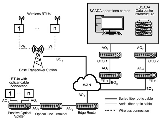 Conversely, the secondary connection method taps into wireless cellular modalities such as Global System for Mobile Communications (GSM), Long-Term Evolution (LTE), or the Fifth-generation broadband cellular network (5G) broadband cellular standard. RTU configured with a mobile network interface is dependent on a modem. All transmissions are encrypted, leveraging VPN tunnels for fortified security, predominantly when transiting public mobile networks. Occasionally, the choice might lean towards a private mobile network. This WAN is directly linked to both a SCADA operational hub and a data repository hosting the requisite server infrastructure for dialogues with the client RTU. While VPN tunnels have the potential to culminate at an ER, high-demand hardware scenarios might necessitate a server exclusively dedicated to VPN liaisons. The role of the SCADA system extends to supervising and orchestrating operations for client networks as well as RTU. Figure 3 represents the diverse connectivity modalities present in the system. The wireless linkages are represented by W ( through ). In contrast, optical conduits are categorized based on their spatial alignment, either above-ground or subterranean. The aerial optical pathways are annotated as AO (–), and the subterranean optical counterparts bear the BO (–) notation.