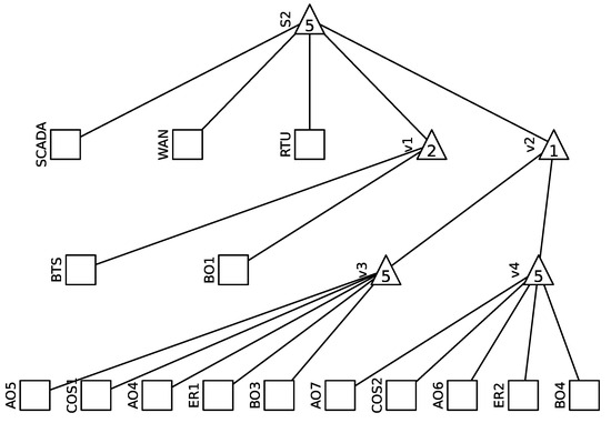 In the test network, as depicted in Figure 4, a similar procedure is administered to the communication segment, which is highlighted in blue. Taking into account the interdependencies between the two infrastructures in the comprehensive test network, the system’s functional correctness is delineated as facilitating LBS operability via the Control Center from the power component of the network. As such, in Figure 4, the pertinent segment of the communication network is emphasized in blue, playing an indispensable role in powering the aforementioned LBS component. Other elements are deemed non-essential for the AG design. The AG tailored for the communication segment of the network, developed in line with the outlined procedure, is illustrated in Figure 6. In this context, solely the interdependencies amidst the constituents of the communication segment are represented within this AG. For the sake of simplicity, both Base Transceiver Station (BTS) and wireless linkage W1 are not accounted for in this depiction, premised on the assumption of their backed-up status, implying they are devoid of failure.