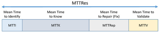 It is imperative to recognize that KPI terminologies and definitions can diverge notably among different suppliers and sectors. The association between these parameters, as detailed across multiple sources, is depicted in Figure 8 and Figure 9. In the first figure is the connection between MTTRes, Mean Time To Identify (MTTI), Mean Time To Known issue (MTTK), MTTRep, and Mean Time To Validate (MTTV), while the subsequent figure emphasizes the relationship between MTBF, MTTRes, and MTTF. In the domain of incident management, MTBF and MTTF stand as paramount reliability metrics. These metrics offer insights into two distinct aspects: the expected time interval between two successive failures (MTBF) and the anticipated duration until a component’s initial failure (MTTF). A salient distinction exists between them.