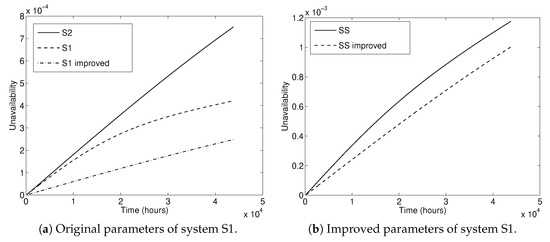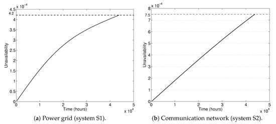 Despite a wealth of research, significant discrepancies in the interpretation of KPI persist across several publications [12,13,14,15,16,17,18,19,20,21,22,23,24,25]. With an intent to address and rectify these inconsistencies, in paper [26], the authors propose a time-dependent reliability analysis tailored for a real critical energy infrastructure use case, which consists of interconnected urban electrical and communication network reliability assessment of highly reliable elements, which leverages exact reliability quantification of highly reliable systems. The software presented in this paper can quantify the reliability of very reliable systems up to , which was demonstrated on a Highly Reliable Markovian System (HRMS) benchmark and also successfully compared with MOCA-RP software [26]. Differentiating from earlier studies, the current investigation of this paper’s authors emphasizes a robust reliability quantification, which is applied to the real interconnected energy infrastructure. The interconnected infrastructure is based on the real system located in the Czech Republic and covers two distinct infrastructures: the power grid and the communication network. For illustrative purposes, the paper introduces a novel version of an interconnected infrastructure test network proposed in [27]. Further, in the realm of time-dependent reliability analysis using AG, pertinent algorithms for discrete maintenance optimization of intricate multi-component systems have been presented in [26]. Given the current discourse in the state of the art, there is an unequivocal demand for specialized software tools that can handle the time-dependent reliability of highly reliable interconnected systems. Pursuing this need, the main aim of this paper is to incorporate the computations related to unavailability into a pre-existing simulator, which has been elaborately discussed in [28].