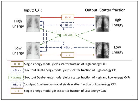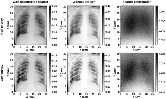 Several studies have made use of dual-energy X-ray absorption images along with deep-learning methods to enhance medical image analysis. Some examples include image segmentation of bones to diagnose and quantify osteoporosis [38], or estimation of phase contrast signal from X-ray images acquired with two energy spectra [39]. Regarding CXRs, the combination of dual energy and deep learning has been used to obtain two separate images with bone and soft-tissue components [40]. However, to the best of our knowledge, the application of dual-energy images to obtain the scatter signal has not yet been examined.