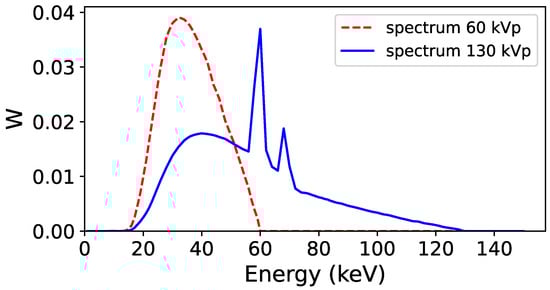 Energy spectra used to acquire the low-energy (60 kVp, red line) and high-energy (130 kVp, blue line) projections in the Monte Carlo simulation. The two spectra were obtained with Specktr toolkit [44,45], with 1.6 mm Al inherent filtration of the tube.