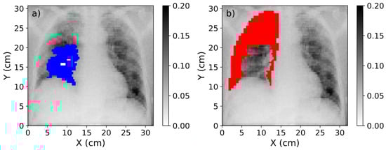 (a) Mask of the region affected by COVID-19 (blue) over the CXR. (b) Mask of the healthy region in the lung (red). The range of values of these images was obtained after the normalization procedure explained in Section 2.2.