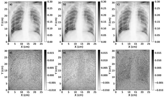 (a) Scatter-corrected image estimated by the single-energy model. (b) Scatter-corrected image estimated by the 1-output dual-energy model. (c) Scatter-corrected image estimated by the 2-output dual-energy model. (d) Difference pixel by pixel between the scatter-corrected ground-truth image (represented in Figure 1) and the scatter-corrected image estimated by the single-energy model. (e) Difference pixel by pixel between the scatter-corrected ground-truth image (represented in Figure 1) and the scatter-corrected image estimated by the 1-output dual-energy model. (f) Difference pixel by pixel between the scatter-corrected ground-truth image (represented in Figure 1) and the scatter-corrected image estimated by the 2-output dual-energy model.