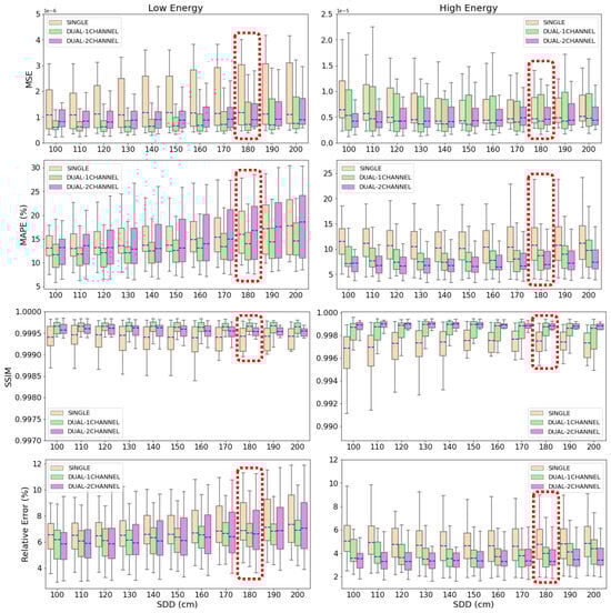 In all graphics in Figure 8, it is observed that the mean values of the metrics evaluated over the test cases remain very similar for the different SDDs in relation to the original SDD with which the NNs were trained. In the high-energy estimations, the biggest increase among all the evaluated SDD for the MSE is 22.6% in the single-energy model, 15.5% in the 1-output dual-energy model, and 2.4% in the 2-output dual-energy model. In the MAPE, the greatest deviation from the mean value corresponding to SDD = 180 cm is 7.3%, 10.7%, and 3.9%, respectively. In the SSIM, the differences among the various SDD cases are barely relevant (0.06%, 0.04%, and 0.01%), while the major differences in the relative error are in the same order that the ones in the MAPE (7.6%, 8.6%, and 2.5% for single, 1-output and 2-output dual-energy algorithms, respectively). Similar results are obtained in the low-energy estimations: the major deviations are 3.1%, 14.0%, and 6.3% in MSE; 8.2%, 5.7%, and 9.0% in MAPE; and 4.1%, 4.5%, and 5.7%, for the single-energy, 1-output, and 2-output dual-energy models. Again, variations in SSIM are negligible. In all cases, the biggest deviations with respect to the original SDD are found either in SDD = 100 cm or SDD = 200 cm. Furthermore, graphics in Figure 8 show that the range of the maximum and minimum values of the metrics for the 22 test cases remains much the same in all SDDs in comparison with the original one.