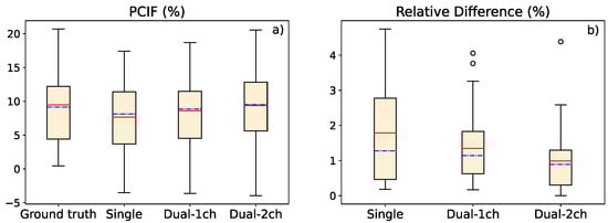 (a) Graphic representation of the percentage contrast improvement factor for ground-truth image, single-energy model estimation, 1-output dual-energy model, and 2-output dual-energy model estimation. (b) Relative difference in the contrast value between ground truth and deep-learning-based estimations. In both graphics, the red solid line represents the average value, while the blue dash-dotted line represents the median value.