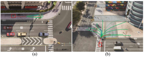 Existing datasets such as ETH and UCY provide only a single ground-truth future pedestrian trajectory and do not offer multiple possible trajectories. To address this limitation, we used the CARLA simulator [47] to create the simulated multi-trajectory datasets (SMTD), which consist of two scenarios: Crossroad and Plaza. In the Crossroad scenario, 100 vehicles and 200 pedestrians move autonomously and randomly, following the default behavior of the CARLA simulator. In the Plaza scenario, 50 vehicles and 150 pedestrians are generated. We preprocessed the simulated trajectories using the same method used for the public datasets. Next, we manually labeled the multiple possible trajectories for the last 12 time steps of the pedestrian trajectories. Figure 4 shows an example of multi-trajectory labeling for one pedestrian. The red trajectory refers to the path simulated by the CARLA simulator, whereas the green trajectories represent all possible paths that the pedestrian could follow in the last 12 time steps. The simulated datasets are only used for evaluating multi-trajectory metrics.