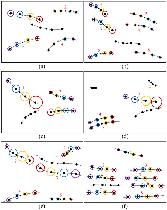 Visualization of social attention weights for various pedestrian interactions: (a) Head-on walking; (b) head-on walking in denser crowds; (c) head-on walking with collision avoidance; (d) collision avoidance; (e) side-by-side walking with collision avoidance; (f) following and walking side by side. Each trajectory contains four positions (black dots) over four consecutive time steps, with arrows indicating the forward directions. Social attention weights for each time step are represented by purple, blue, orange, and red circles, respectively. The circle size corresponds to the social attention weight.