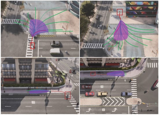 Figure 6 showcases the SSA-GAN’s multi-trajectory prediction performance on simulated multi-trajectory datasets. In the figure, the red lines represent the target pedestrian’s trajectory obtained from the CARLA simulator, whereas the green lines represent manually annotated trajectories adhering to social norms. The purple area represents an envelope diagram containing the 25 predicted trajectories generated by the SSA-GAN, all of which fall within this area. The figure reveals that the SSA-GAN has a robust ability to generate diverse trajectories covering a range of plausible future trajectories across all four scenarios.