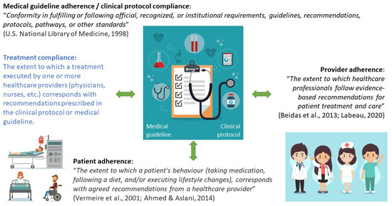 Compliance in the medical domain defined, showing the general definition by the U.S. National Library of Medicine [34] and the different perspectives of patient adherence [31,32] and provider adherence [17,33], including the perspective of treatment compliance, as proposed in this paper. (Images by Freepik).