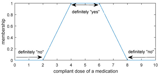 In the work shown above, an activity could be only compliant or non-compliant with the protocol. In [13], we propose to consider compliance of a single activity not as a binary state, but as a matter of degree. In this approach, each activity in a protocol is associated with a compliance level. For instance, consider an activity of drug administration. There are several dimensions in which it can be compliant with the protocol: the order, or the place in which it happened in the execution trace (cf. process mining), the timing (did it happen in the right time frame after, e.g., the previous activity), the dose, etc. For this illustrative case, let us consider the dose dimension only. In this case, the compliance level can be defined using a fuzzy set with a trapezoidal membership function, e.g., as shown in Figure 2, with four clearly defined threshold points in which dose deviation is perfectly OK (compliance degree of 1) and dose deviation is completely not OK (compliance degree of 0). For the values in-between, we use linear interpolation. The use of such membership function was already advocated by Zadeh [65] since it is easy to understand by domain experts and provides a good compromise between a so-called cointension and computational complexity. In this context, cointension indicates the degree between the explicit semantics, defined by the formal parameter settings of the model and the implicit semantics conveyed to the reader by the linguistic representation of knowledge.