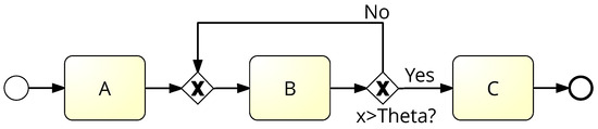 We will use the following notation in this paper. Let us consider a protocol P, which consists of n unique activities , . The protocol P may include decision points, as well as loops in which certain activities can be repeated. For instance, consider a protocol shown in Figure 3. In this protocol, there are three unique activities A, B and C. Therefore, . First, activity A should be performed. Next, activity B is iteratively performed until value x exceeds a certain threshold value Theta.