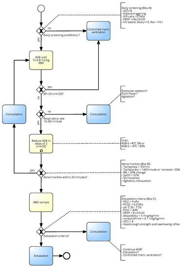 - Blackwood, B.; Alderdice, F.; Burns, K.; Cardwell, C.; Lavery, G.; O’Halloran, P. Use of weaning protocols for reducing duration of mechanical ventilation in critically ill adult patients: Cochrane systematic review and meta-analysis. BMJ 2011, 342, c7237. [Google Scholar] [CrossRef]