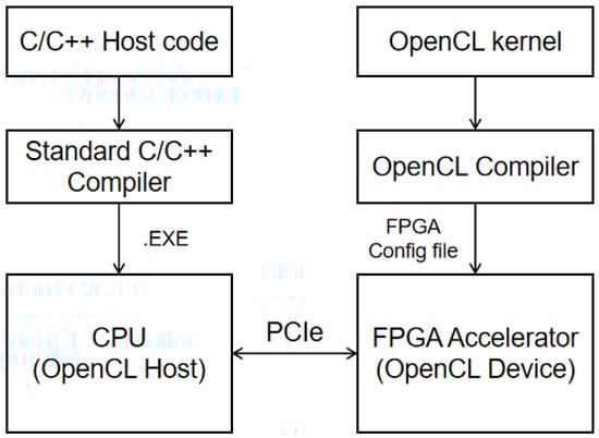 OpenCL is an open, cross-platform, high-level parallel programming language that can be used for GPU and FPGA development. Figure 1 summarizes the development flow of an OpenCL-based FPGA. In the framework, FPGAs (as OpenCL devices) are connected to CPUs (as OpenCL hosts) through high-speed PCIe to form heterogeneous computing systems. An OpenCL code written in a dialect of C/C++ defines multiple parallel computation units (CUs) in the form of kernel functions, which are compiled and synthesized to run on the FPGA. On the host side, the C/C++ code runs on the CPU, providing an application programming interface (API) to communicate with the kernels implemented on the FPGA. This work used the Altera OpenCL SDK toolset to compile, implement, and profile the OpenCL code on the FPGA.