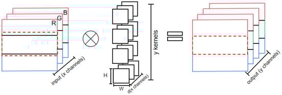 Convolutional neural networks (CNNs) are mainly used in computer vision applications, such as image classification, video recognition, and face detection [,]. Usually, CNN inference is a resource-consuming task, as intermediate results and weights occupy a large memory footprint, and various operations require a large amount of computation. The accuracy of CNN-based algorithms has improved significantly in the last decade due to the increased data and enhanced network structure.