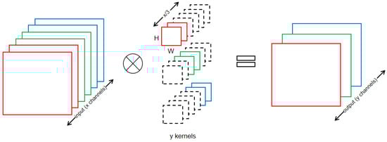 In general, the convolutional layer (CL) is the most resource-intensive layer in a CNN. In a CNN model, a CL contains hundreds of convolutional kernels (y). The convolutional operation aims to generate the output by sliding the convolutional kernel over the input. Since the convolutional kernel is a three-dimensional (width, height, depth) tensor, the core of convolution is a three-dimensional multiplicative accumulation operation. This is shown in Equation (1).
