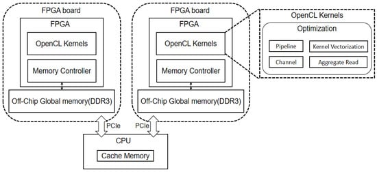 Based on the above optimization strategies, an overall architecture could be designed. In the process of inference, interactions between the kernels of each layer were transmitted through channels, data were read by aggregation, and kernels were vectorized. In this design, the data transfer process overlapped with the parallel execution of the kernels on the FPGA, which avoided the impact on the FPGA computational performance. The overall architecture of design is shown in Figure 4. The overall architecture was composed of one CPU, two FPGAs, and DDR3 memory. The CPU played the role of synchronizing the data in the middle of the multi-FPGA devices during CNN inference.