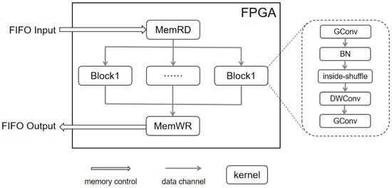 The proposed FPGA internal design is shown in Figure 5, including the design of each module and the data flow control. MemRD was used to obtain the image data and weights from the host side. MemWR was used to write the computation results from the kernel side to the host side. Block represents the computation unit corresponding to the CNN. Each Block computation ended with residual learning, which needed to be written back to the host side via MemWR for synchronization. In addition, the on-chip memory was implemented using M20K memory blocks, each with a 20K bits capacity. Only when the memory depth was greater than the maximum depth of one M20K block was another M20K block added.