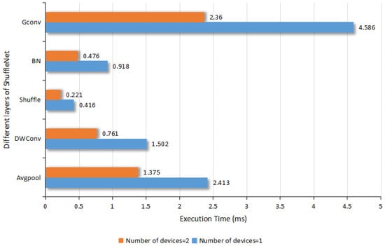 As presented in Figure 6, the time comparison showed that the model parallelism had a good acceleration effect when using two FPGAs. The running time required for each layer basically demonstrated a linearly proportional reduction, achieving a speed-up ratio of 1.9×. However, in the I-ShuffleNet version, the model with two devices was 1.42× faster than the model with one device. Because model parallelism requires synchronization time, it is not linearly proportional.