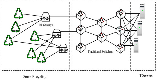 This section describes the system model, and then the problems’ definitions are presented. Modern consumer product recycling can only be optimized by thoroughly comprehending the whole recycling system as a dynamic feedback mechanism [24]. Governments and businesses invest tens of thousands of dollars in waste management each year, but they never reach 100% efficiency. Sometimes the collection schedules and frequency are not well thought out, or the bins are placed in the incorrect locations. Smart bins, which include the IoT, sensors, and eco-friendly technology to enhance city garbage management systems, have been developed to address this issue. Due to significant ecological concerns, academics have been paying close attention to emission reduction, carbon labeling, energy conservation, trade, and footprint. Leveraging, architecture, and enabling technology are the three ideas that make up Green IoT. Architectural technologies, to begin with, pertain to energy-efficient device designs, network structures, communication protocols, and linkages. Additionally, leverage technologies pertain to reducing carbon emissions and increasing energy efficiency, enabling technologies to assist the IoT to become more efficient by lowering energy usage, resource usage, hazardous emissions, and pollution. Therefore, Green IoT contributes to preserving natural resources, reducing costs, and reducing technology’s influence on the ecosystem and human wellness. So, Green IoT focuses on green production, green design, green usage, and green disposal [25]. The most common IoT architectural model comprises three levels, as shown in Figure 1, including network, application, and perception layers. The first layer of the three-layer architectural model is the objects or perception layer, which refers to IoT devices and physical sensors responsible for gathering and processing data and having sensors to detect and obtain info about their surroundings. It recognizes other intelligent objects nearby or picks up on specific physical characteristics. Connecting to other network devices, smart objects, and servers is the responsibility of the network layer. Its capabilities are also utilized in the transmission and processing of sensor data. This layer has two sublayers: a routing layer that manages packet transmission from source to destination, and an encapsulation layer that creates packets. The application layer is responsible for delivering the services that subscribers demand. It describes numerous IoT applications, such as smart cities, homes, recycling, and health [26,27,28].