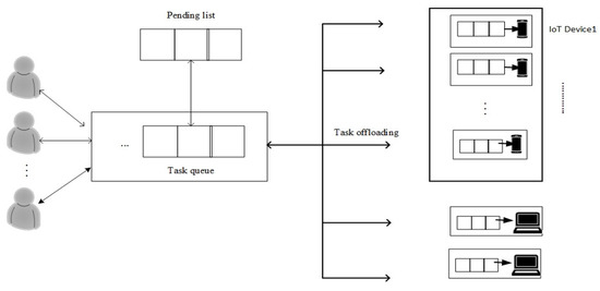 The first module, Task Pre-Processor (TPP), operates within the IoT gateway and performs preprocessing of specific activities depending on user queries. The primary function of an IoT gateway is to generate task groups and assign virtual items to lead them. TPP is utilized for task preprocessing, which is required to build task groups. TPP is in charge of breaking down user requests into numerous tasks and determining which sensors are needed to complete each task. In total, IoT devices must process two types of tasks [11]: spatial and temporal tasks. Tasks that require information from a particular place or expressly reference a location are classed as spatial activities; tasks that are time-sensitive and prioritize completion time are categorized as temporal tasks. Because time is the most important restriction in temporal activities, they are never negotiable. However, the spatial tasks may be negotiable. Tasks that are not negotiable cannot be postponed when tasks at the IoT gateway are spatial, temporal, non-negotiable, or negotiable. Non-negotiable tasks can be allocated to sensor nodes for instant implementation; however, negotiable tasks can have a maximum delay before execution. Thus, load balancing is required when ordering them. They are kept in a task pool and then categorized according to their placement. The virtual leader node is in charge of leading the workgroup. As a result, it contains the details of all nodes that have joined that task group. Hence, the virtual leader is responsible for choosing the way to send task packets across task groups to finish the work (Figure 2). Non-negotiable activities will already be sent to TPS, while negotiable tasks will be split into groups, with only the leader tasks from each group being assigned to TPS. TPS schedules tasks according to the delay. The task with the least time latency will be scheduled first in the implementation queue, followed by tasks with a longer delay. They presented a load-balancing approach for greater performance since one node may be needed to execute many activities, leading to overloading.