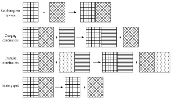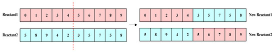 - Synthesis reaction: A new reactant is showed as R = (r1, ..., ri, ..., rn), where where is a randomly selected number in [−0.25, 1.25]. It is comparable to the planned expanded line crossover operator in [36]. Figure 7 illustrates this procedure.