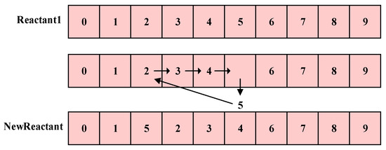 where r is a random integer between 0 ≤ r < 1. We take into account the size of population P as |P| and the number of elements in the created reactants R as |R|, respectively. Since R0 and R1 are separated into three sections, if |R|< |P|, the value of k is raised by 1, and 23 − 2 = 8 − 2 = 6 reactants may be extracted from R0 and R1, which are not in R. The following is a list of these reactants (Figure 6).