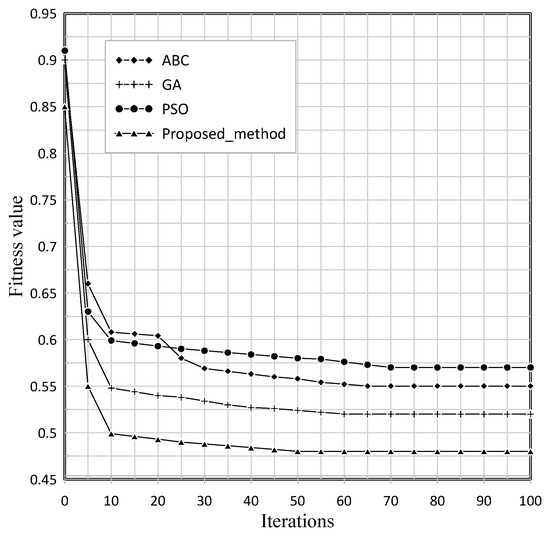 The methodology outcomes are compared to the ABC, GA, and PSO algorithms and suggested method in this section. The relative performance for the varied number of iterations is evaluated by computing the objective function and how it functions to optimize the method, as illustrated in Figure 10. The fitness of 100 generations is evaluated in this simulation. The fitness function grows as the generations grow. The fitness quantity among the 30th and 100th generations has fallen to its minimum point, 0.48, as can be observed.