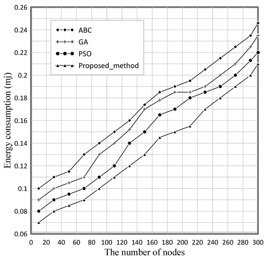 Comparison of ABC, GA, PSO, and the proposed method in energy consumption.