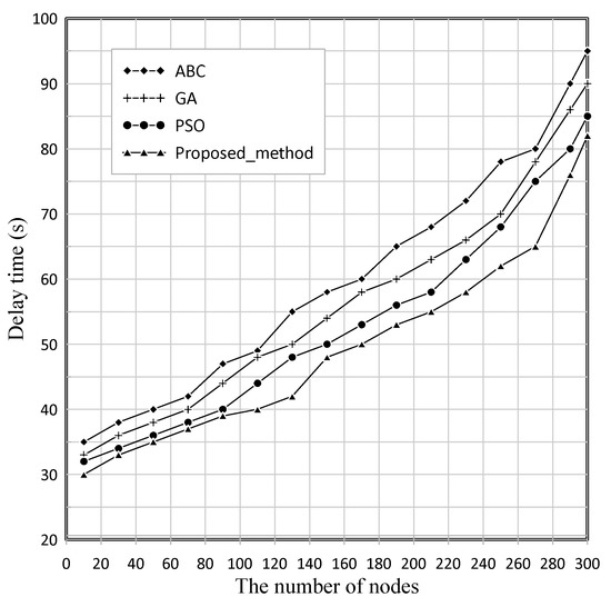 The delay time is one of the most significant metrics for assessing the network performance. The suggested technique’s delay analysis is shown in Figure 13 compared to the ABC, GA, and PSO algorithms. The obtained results show that the delay time has significantly decreased compared to the previous methods.