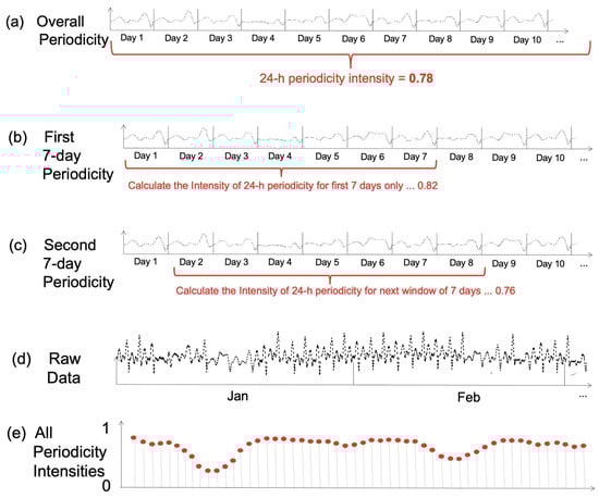 Schematic demonstrating the calculation of periodicity intensity throughout a time series using time-lagged overlapping windows. (a) shows overall periodicity for a time series, (b) shows periodicity calculated for the first 7 days only, (c) shows periodicity for 7 days with a shift of 1 day, (d) shows some sample raw data and (e) shows periodicity intensity calculated for the whole time series.