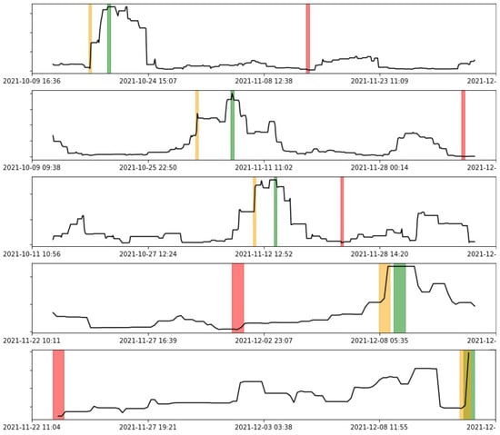 We now present an in-depth analysis and discussion of the results of applying periodicity intensity to students’ online learning habits. The periodicity intensity graphs for each student were made available to them at the end of the teaching semester, supported by a short-form informative YouTube video to explain the graphs and to ensure they understood how to interpret them. Five sample graphs are shown in Figure 3. In each graph, the periodicity intensity values are normalised to a [0, 1] range to smooth out variance across students and to make each graph equally legible. This is similar to the older adult participants in the previous study in that each student will be interested in the relative changes in their own graph rather than in absolute values or in comparison to others. We also added 3 coloured vertical bands to each graph, red indicating the period of lowest periodicity intensity, green indicating the period of highest and yellow indicating the period of greatest (steepest) change. The parameters used in the calculation of the graphs are a frequency of 24 h, a window size of 7 days and a window shift or stride of 3 h.