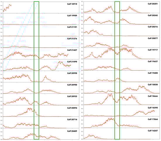 Figure 5 shows the 24 individual periodicity intensity graphs, and the first 4 in the left column and the 3rd in the right column were discarded for reasons mentioned earlier. The vertical green lines in the graph indicate the dates of disbudding, a process of the surgical removal of horn buds before the calves grow and cause danger to other calves and to the farmer [].