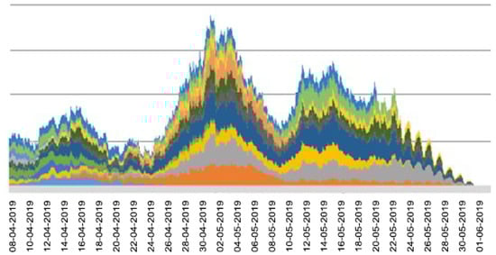 Looking across the set of 19 graphs, it is difficult to discern any coordinated pattern across the herd. When we generate a stacked graph of the time-aligned periodicity intensities in the same way as was performed for the student VLE accesses, we get the graph shown in Figure 6, where each colour represents periodicity intensity for a different calf.
