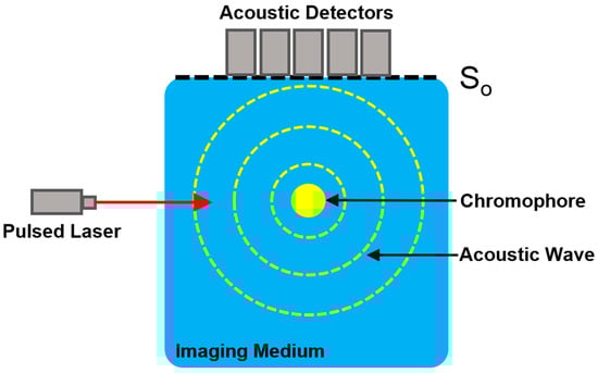 Diagram illustrating the process of photoacoustic signal generation and detection. Chromophores absorb the incident pulsed laser light and undergo thermoelastic expansion to generate acoustic waves. Acoustic detectors along the measurement boundary So are used to measure the acoustic waves.