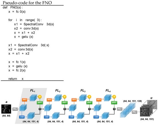 Finite dimensional operators use a deep convolutional neural network (CNN) to solve the PDE on a finite Euclidean Space [,]. This approach is mesh-dependent, meaning the CNN needs to be retrained for solving the PDE at different spatial resolutions and discretization. Neural finite element models are mesh-independent and closely resemble traditional finite element methods [,]. It replaces the set of local basis functions in the finite element models with a fully connected neural network. It requires prior knowledge of the underlying PDE and is designed to solve for one specific instance of the PDE. The neural network needs to be retrained for new instances where the underlying PDE is parameterized with a different set of functional coefficients. FNO is a mesh-free approach that approximates the mapping between two infinite dimensional spaces from a finite collection of input–output paired observations [,]. The neural operator is learned directly in the Fourier and image space using a CNN. The same learned operator can be used without retraining to solve PDEs with different discretization and parameterization. Fourier Neural Operators have been demonstrated to achieve state-of-the-art results for a variety of PDEs (e.g., Burgers’ equation, Darcy Flow and Navier–Stokes) and outperform other existing deep learning methods [].