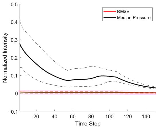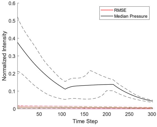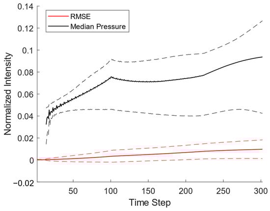 RMSE and standard deviation bands between the k-Wave and FNO simulations on the breast vasculature test dataset. Distribution of pressures (25th, 50th and 75th percentiles) are provided as a frame of reference.
