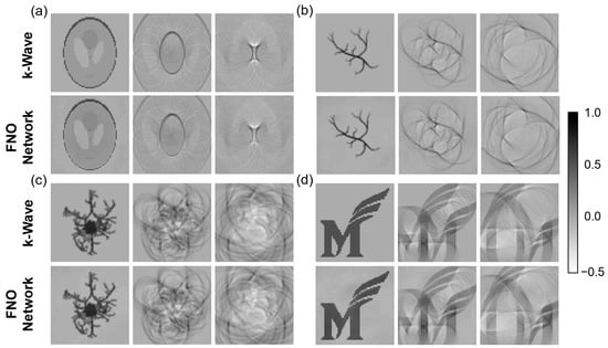 - Simulations from the FNO network and the widely used k-Wave toolbox for time domain acoustic wave propagation [] were compared in terms of accuracy and computation times.
