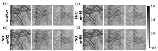 The FNO was trained on simulations with a 128 × 128 × 302 computational grid and was then used for zero-shot super resolution to simulate wave propagation on larger-sized grids. This was completed on an animal image from the testing dataset and a vasculature image to evaluate generalizability. The FNO simulations for both images strongly resembled their respective higher-resolution simulations using k-Wave (Figure 11). Errors could be seen in the background. The FNO simulations also had a more blurred appearance, as seen in the zoomed regions. This was likely due to the truncation of Fourier modes leading to the loss of high-frequency information that is useful for retaining sharper details in an image. Truncation errors became more prevalent for larger grid sizes using the FNO’s super resolution feature (Table 2).