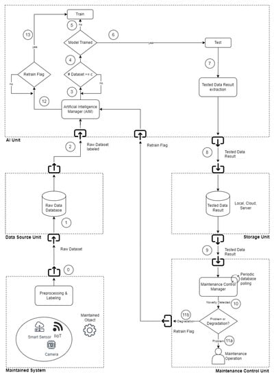 The elements of this section interconnect the machine’s parts under study with the software framework. This module can be composed of sensors, cameras, machine logs, and every element can help the data collection phase. As mentioned, this framework’s essence is based on comparing the initial trained data to the actual ones to recognize if some difference appears in the data pattern. In a real environment, two possible situations can be found: