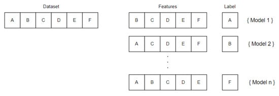For this reason, the trained dataset must represent the whole machine’s behavior. The number of datasets chosen for the training depends on the framework’s application: by increasing the number of training datasets, the prediction’s accuracy increases too (the risk of a false positive due to a change is low); however, training the framework with a small number of datasets allows using it earlier, but the maintainer may work more during the first days by updating it (the risk of detecting a change is higher). A trade-off concerning the duration of the training process has to be defined. Generally, companies that design machines/components always have a period in which the machine/component is calibrated and tested; this period can last from a few days to an entire month, and it could be useful for the training process. An entire environmental changes cycle (such as the morning, the afternoon, and the night) can be useful for gathering all the possible components’ changes. Sometimes the data collected can change over the day: during the morning, when the temperature is low, the machine has a certain accuracy that changes during the afternoon due to the higher temperature reached. There is no general rule explaining how many datasets are gathered; a possible hint is to collect one week’s worth of data to record a consistent dataset. The best situation in which this framework can be trained is at the beginning of the machine’s life (e.g., after the assembly process). Nevertheless, the framework can also be trained after years of machine work; in this case, the framework performs the training at that moment and cannot recognize preexisting faults due to the absence of healthy datasets. However, the nature of failures leads to a machine’s worsening over time, detecting them also if training is performed with a partially faulty system; hence, thanks to the system’s adaptability, the absence of a healthy dataset is not a problem, but it may afflict the framework’s accuracy. The first stage of the ML process flow is preprocessing, which consists in taking every single dataset from the database and recognizing which kind of features are stored (such as Acceleration, Sound, or Temperature). Then the AI manager applies a windowing function for each type of feature recognized: the windowing approach divides the large dataset’s features into a parametrized small number of windows (for example, acceleration is divided into windows, sound into windows) depending on the resolution wanted in the framework recognition: a higher number of windows corresponds to a higher prediction’s resolution; on the other hand, the system works more complexly due to the higher number of windows to predict. Each window is associated with a predictor (AIUP), which uses window as a label and the others as features (Figure 5). Thanks to the windowing approach, each window is used to perform computation by condensing the initial amount of data (a cumulative sum is used for each window in this paper). The mathematical representation of the windowing function and cumulative absolute sum for each window is reported below: