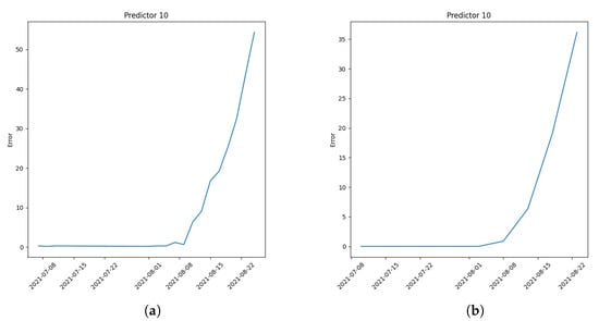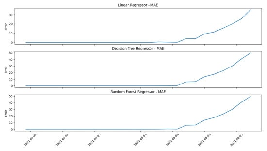 As shown in Figure 7 there is a substantial difference between the obtained results; the last two graphs are more disrupted than the first two because they follow the prediction’s behavior faster. As in the AI model selection case, there is no particular rule for the error model selection. A possible solution could be to configure all four error models to monitor the deviation by creating dedicated predictor agents to perform the computation, but this creates waste from a computational energy point of view. The latter two error models show very similar behavior because of the huge likeness in the formula behind them; with the same number of samples, the MAE has while RMSE has , multiply the square root member. The similarity in the graphs above is due to the number of data used for the computation: when the number is low, the and are very comparable, also bringing a similarity in the results obtained. In this case, the operator can again choose which error model or which error models the framework has to use to monitor the behavior of the machine. In this paper and the following case studies, the error chosen for the evaluation is the MAE. Figure 8a,b show two examples in which the error is computed with two sample ranges n; Figure 8a shows the last two records while Figure 8b shows the last five records:
