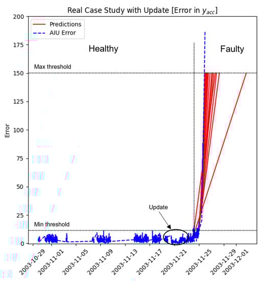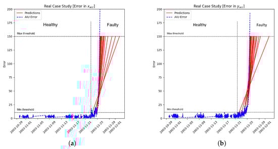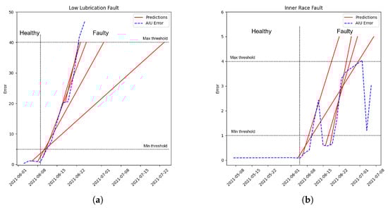 The “Low Lubrication Case” of the “Digital Model” (better explained in the following paragraph) is used as a representative example to see how the mentioned models work in order to compare them. Generally, a system works always in the same way: at the beginning of life, when it is healthy, the error computed by the model’s prediction is low; when the failure appears, the error’s prediction starts to increase. A further confirmation that a general system works in this manner is shown in Section 5 in which the real cases behave exactly like the digital model used for the proof-of-concept, starting with a low error that increases at the end of the life when the failure appears. This general behavior is shown in Figure 6 and Figure 7: the former concerns the models’ selection, while the latter represents the errors’ selection.