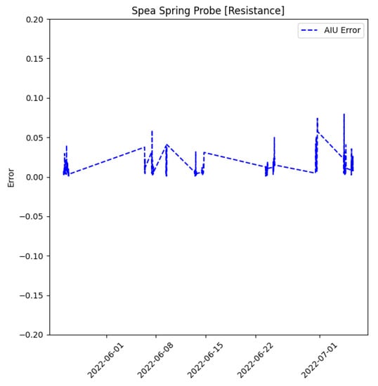 The result of AIU computation is the blue dashed line in the graphs above, corresponding to the MAE error degradation of a probe computed on electrical resistance data over time. MAE is stable and fixed around zero; apart from a few low amplitude disturbances, no degradation appeared on the dataset. Hence, there are no significant changes from the initial trained model, meaning that the probe is not worn. As explained in the real case, the blue straight dashed lines that appear in the data pattern are due to data missing during that period. The data acquisition lasts a few hours, while the idle period without acquisitions lasts numerous days; this different scale range creates long lines. The graph reported in Figure 19 shows that no shift appears in the data pattern; finally, no general deviation appears, which is a symptom that no relevant changes or problems are happening. This prototypical application confirms that incoming data does not change from the training ones. Hence, future works regard the ongoing collection of other data to identify possible future changes related to failures.