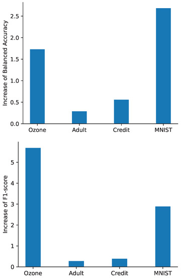 To observe the results more clearly, Figure 1 exhibits the mean increase in balanced accuracy and F1-score for each of the datasets across all data-transformation techniques. It is evident that NBSBS-R helps the generalization performance of most setups that were tested.