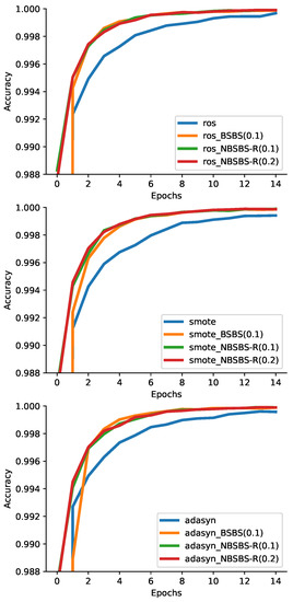 In principle, the BSBS algorithm is used to improve the convergence speed of the neural network. With the addition of the three new variations of the algorithm—(BSBS-R, NBSBS, and NBSBS-R)—it is imperative to examine how these affect the convergence of the model in general. Usually, the convergence speed is measured the number of epochs it takes to reach a certain score in loss (or accuracy) with respect to the trainset. In order to show that, we will plot the training curve of the accuracy over the epochs of the model. Three data transformation methods were selected for this, ROS, SMOTE and Adasyn. We chose these three because they construct a bigger dataset (oversampling), which will better display the comparison of training speeds. Four setups are compared: training without BSBS, a BSBS(0.1), a NBSBS-R(0.1), and, lastly, a NBSBS-R(0.2). In Figure 2, the training curves are displayed. All BSBS methods are converging much faster, and we can see, in the SMOTE graph, in the middle, that NBSBS-R is a little faster than BSBS at the first epochs, which shows that the variants could be able to achieve better speed at certain situations. Overall, it is clear that the convergence boost that BSBS provides does not decrease when using the variants. On the contrary, it can be beneficial sometimes, although this has to be proven with more experiments and is left as future work.