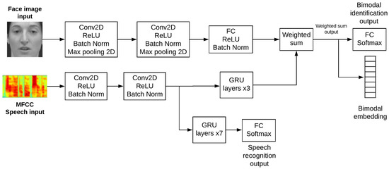 Another useful approach in multimodal biometric systems is based on Multi-task learning (MTL) models. MTL refers to the process of learning multiple related tasks while exploiting similar characteristics across them [8]. It is usually straightforward to develop multiple classifiers to perform a specific set of tasks, though this requires more computing resources and introduces the possibility of processing the same data multiple times [9]. MTL aims to increase the performance of a modelβs tasks by jointly learning them, i.e., one task is regularized/improved by the others by enhancing the overall generalization of the model [10,11]. In our work we take advantage of the fact that identification and speech recognition share the speech features. Therefore, the modelβs parameters related to the speech input are optimized to improve the performance in both tasks.